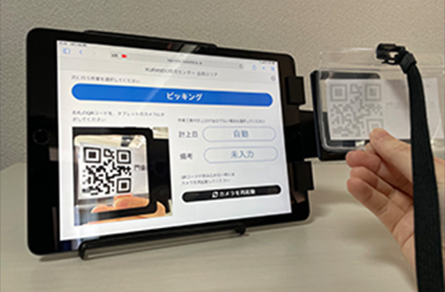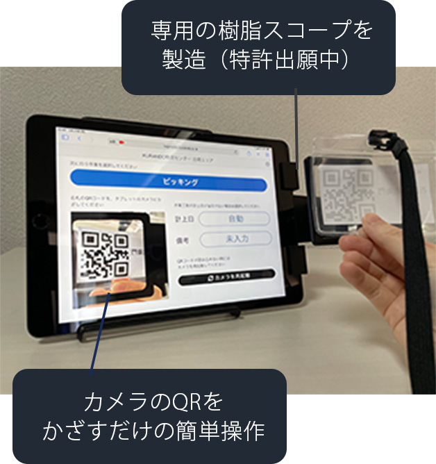 作業者はタブレットで作業を選び、QRコードをかざすだけ。機械に慣れていない人でも簡単に登録できます。