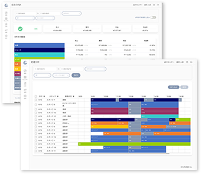 登録内容はリアルタイムで連携され、作業者の配置状況チェックや生産性/収支実績などの集計レポートを出力できます。